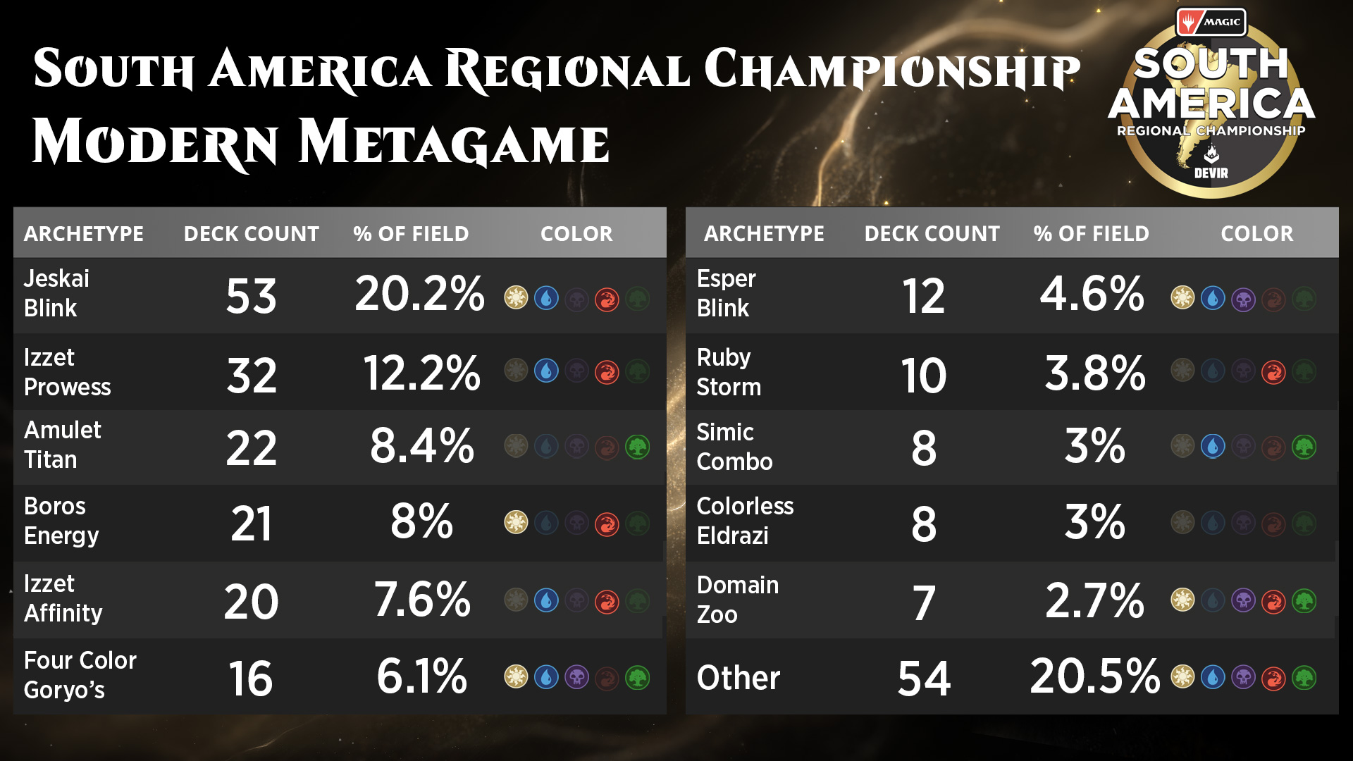 Logo atrás, Izzet Prowess apareceu com 12,2%, mostrando que o plano agressivo-pressão ainda tem seu espaço. E aí vem o dado mais intrigante da tabela: 22 jogadores registraram Amulet Titan, formando 8,4% do torneio. É um deck explosivo, absurdamente forte nas mãos certas, mas também um dos mais difíceis de pilotar no Modern. Ver tanta gente apostando nele reforça que a região está confortável em abraçar estratégias técnicas, e isso sempre puxa o nível competitivo para cima.