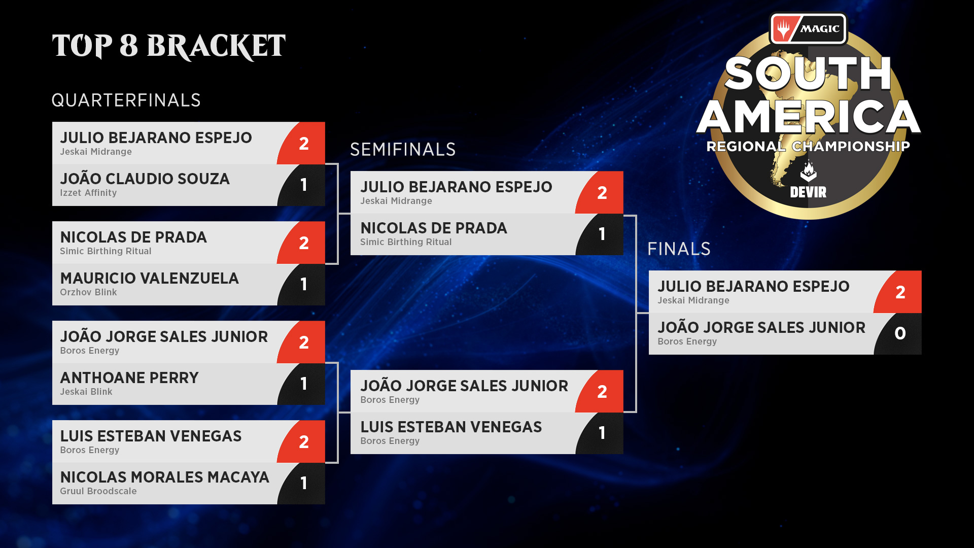 O Top 4 mostrou exatamente por que essa edição do South America Regional Championship foi tão disputada. Nas semifinais, Julio Bejarano Espejo deixou claro que estava em ótima fase ao vencer Nicolas De Prada por 2 a 1, enquanto João Jorge Sales Junior garantiu sua vaga na final ao superar Luis Esteban Venegas, também por 2 a 1, em uma mirror match.